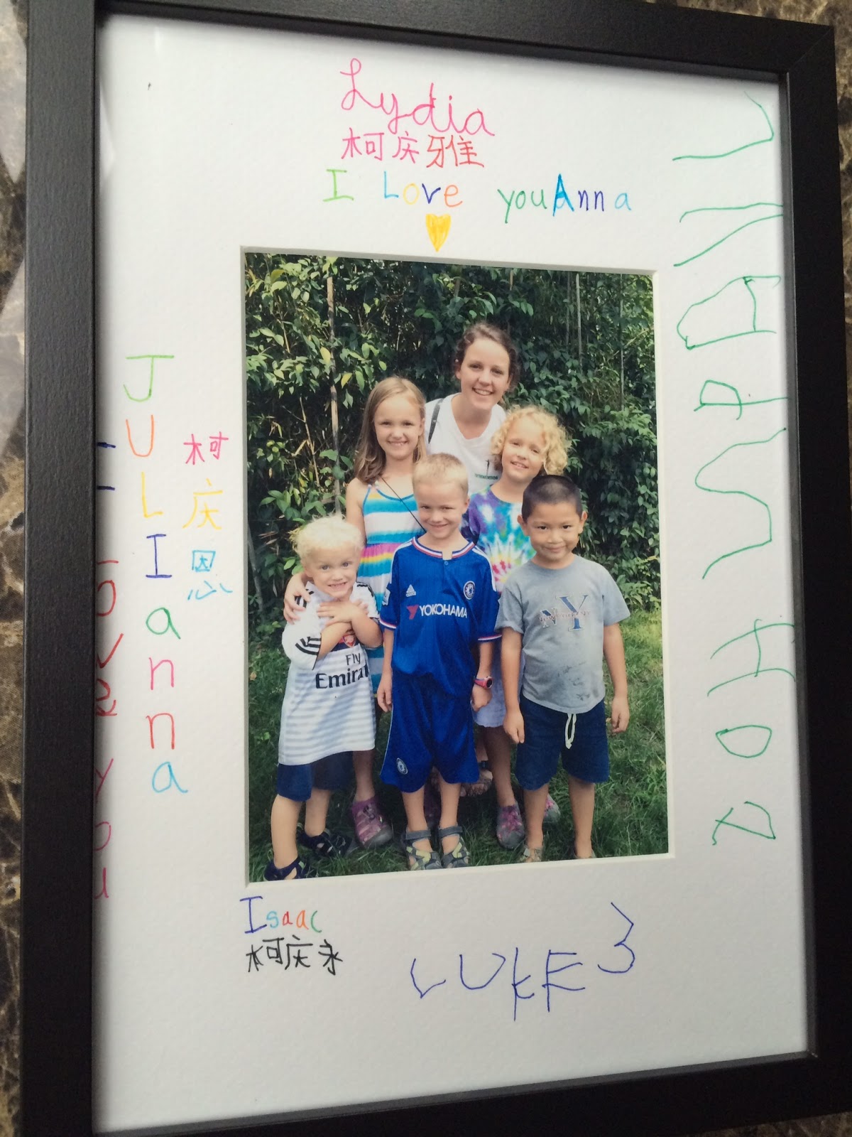 Thank you sweet Laura! Anna is so blessed by your friendship and the loving way your family received her. You will have to come and visit us when you come to the States!!! God bless you all! And that frame is sitting right on her chest of drawers and each of you are sitting right in her heart. :)
